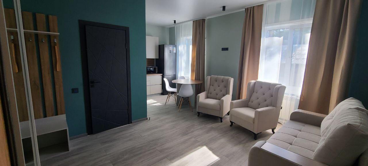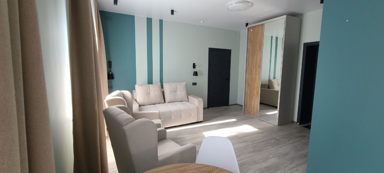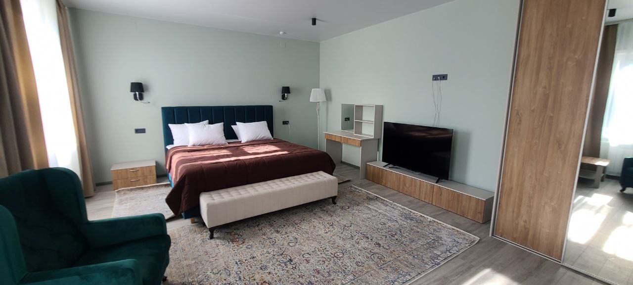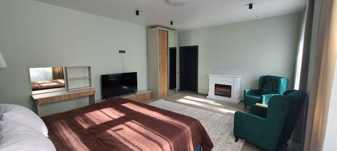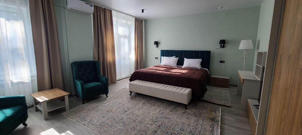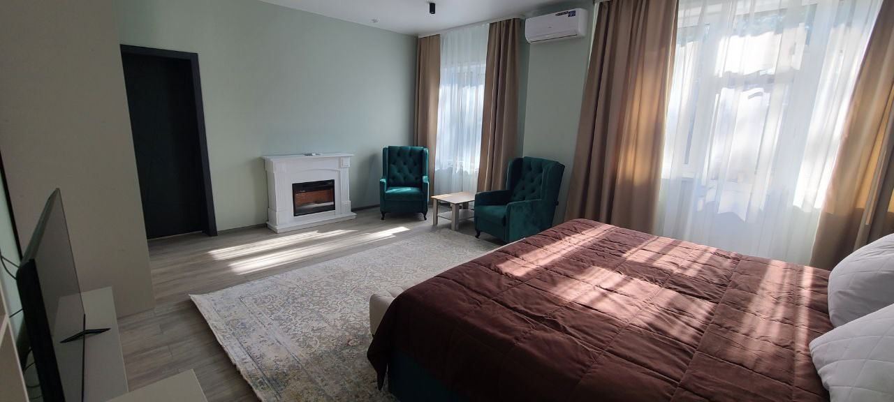 2 осн. места. 2 доп. места. Мебель: диван раскладной, зеркало, кресла, кровать двуспальная, стол, шкаф. Оборудование: телевизор ЖК, чайный набор посуды. Санузел: с душем, туалетные принадлежности, фен. Сервис: Wi-Fi бесплатно, мини-бар, смена полотенец, смена постельного белья, уборка номера.