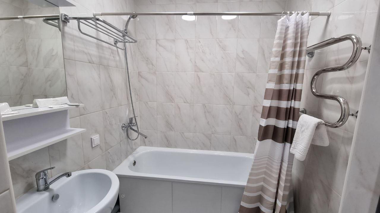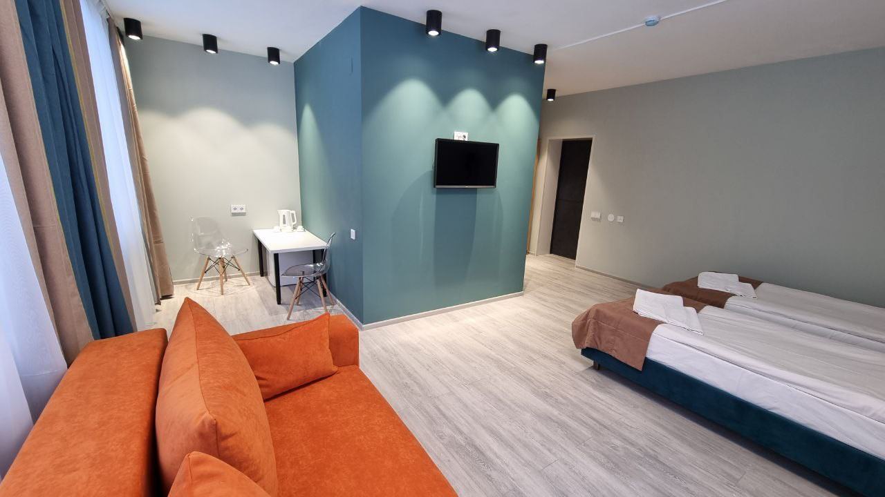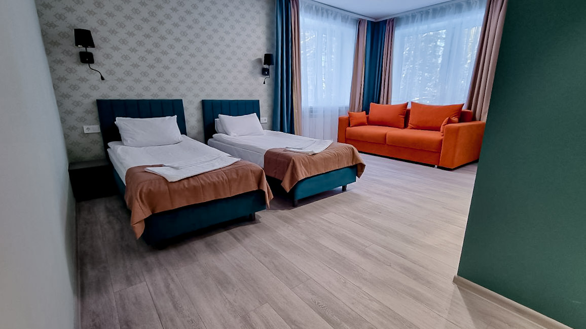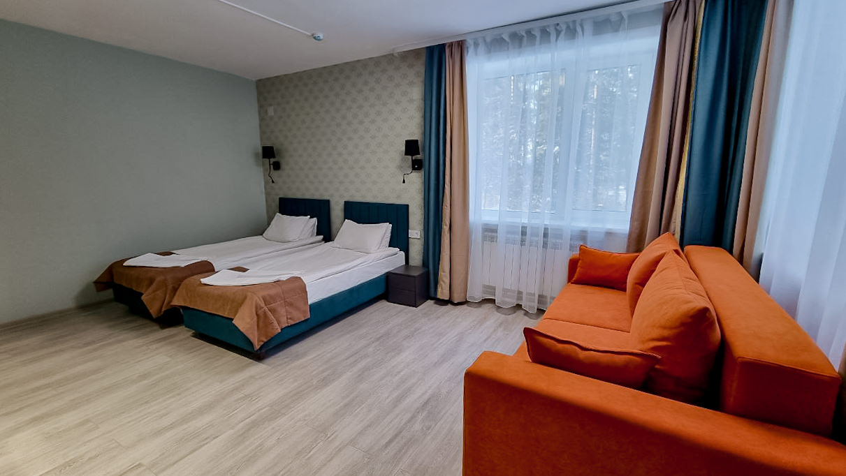 Площадь номера - 30 кв.м. 2 осн. места. 2 доп. места. Мебель: диван раскладной, зеркало, кровати односпальные (2), прикроватные тумбочки, стол, стулья, шкаф. Оборудование: мини-холодильник, телевизор ЖК, чайный набор посуды, электрочайник. Санузел: с ванной/душем, туалетные принадлежности, фен. Сервис: Wi-Fi бесплатно, смена полотенец, смена постельного белья, уборка номера.