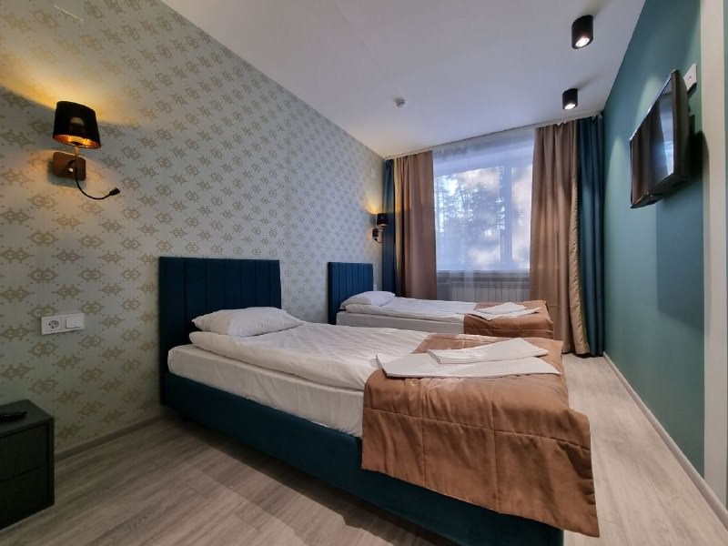 Площадь номера - 30 кв.м. 2 осн. места. 2 доп. места. Мебель: диван раскладной, зеркало, кровати односпальные (2), прикроватные тумбочки, стол, стулья, шкаф. Оборудование: мини-холодильник, телевизор ЖК, чайный набор посуды. Санузел: с ванной/душем, туалетные принадлежности, фен. Сервис: Wi-Fi бесплатно, смена полотенец, смена постельного белья, уборка номера.